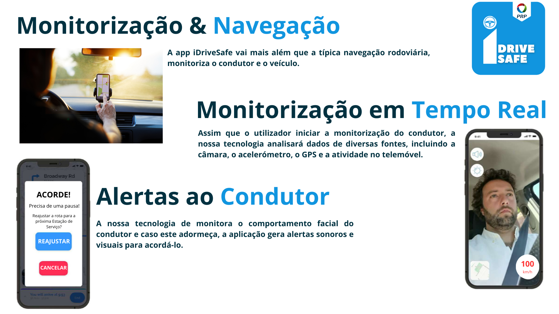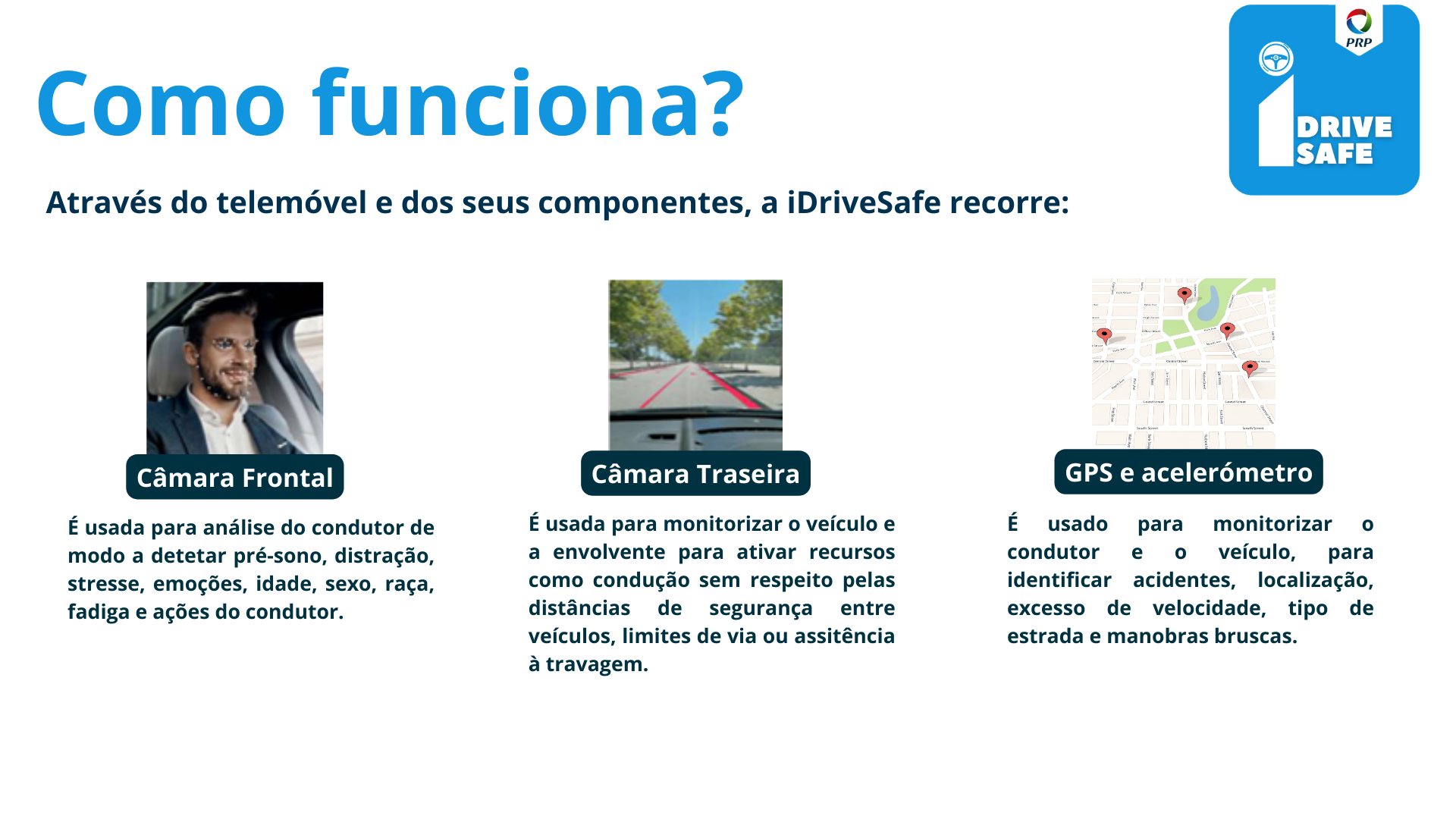 Esta aplicação utiliza as funcionalidades dos smartphones para detetar e resolver problemas críticos, como a fadiga, a distração e a sonolência do condutor. Ao analisar várias pistas visuais e comportamentais, os algoritmos inteligentes da iDriveSafe podem identificar sinais de fadiga e distração do condutor em tempo real e fornecer alertas imediatos aos condutores, através de um ruído forte para despertar um condutor sonolento ou de um lembrete para voltar a concentrar a sua atenção, garantindo que se mantêm acordados, concentrados e atentos à tarefa da condução.