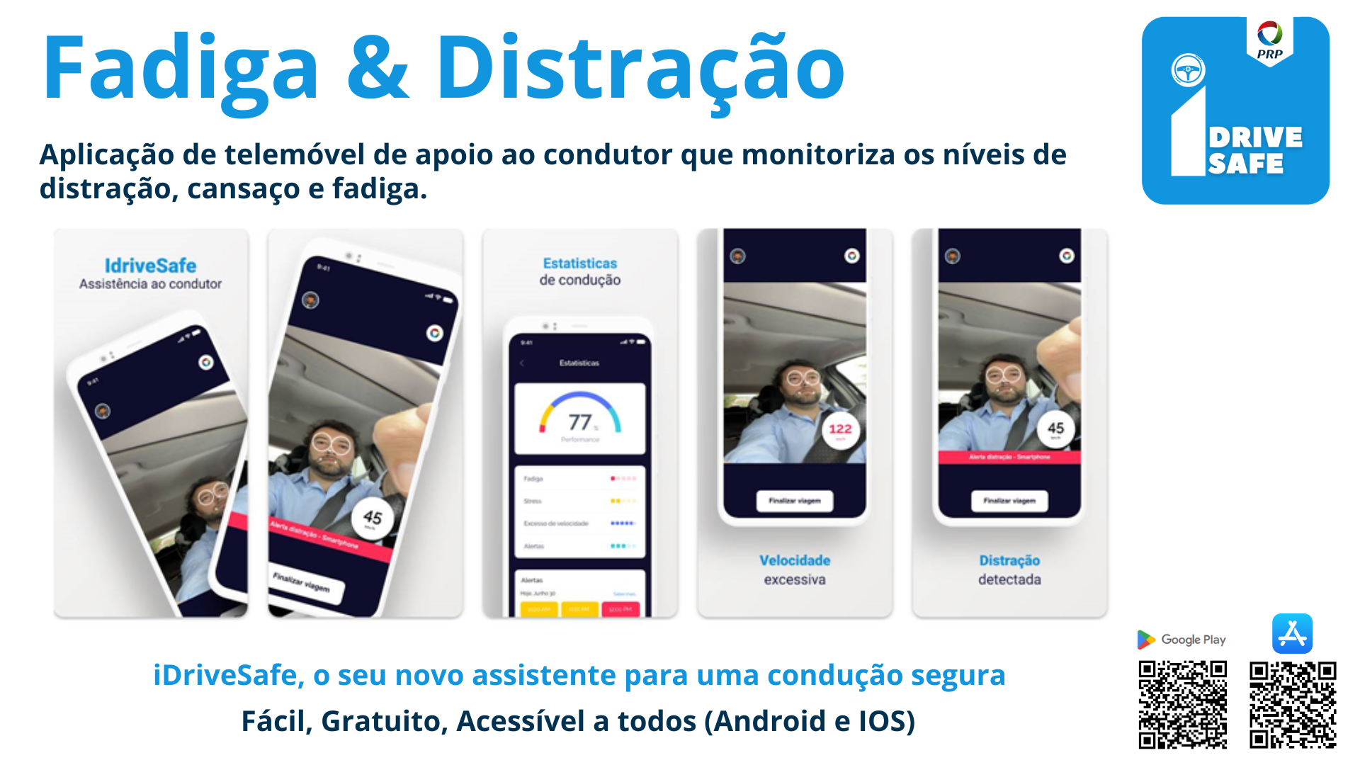Trata-se de uma aplicação de Segurança Rodoviária que visa reduzir o risco de acidente, alertando o condutor para fatores de risco, como a fadiga e distração.