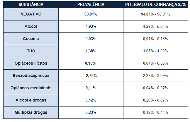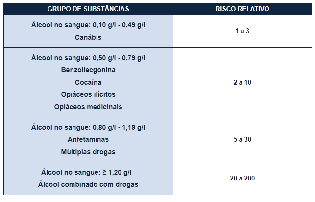 Dados do mesmo projeto estimam que em Portugal, em 2008/2009, cerca de 1 em cada 10 condutores circulavam sob o efeito de substâncias que podem diminuir as capacidades para conduzir em segurança e levar a comportamentos de risco (drogas ilícitas, medicamentos e /ou álcool).